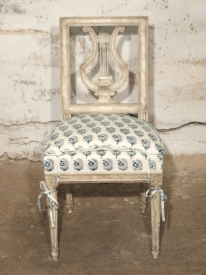 Late 19th c. Gustavian Style Lyre Back Chair. Painted in my signature swedish finish and upholstered in an organic hand block printed fabric in indigo. Thin down cushion with ballerina ties on each leg.